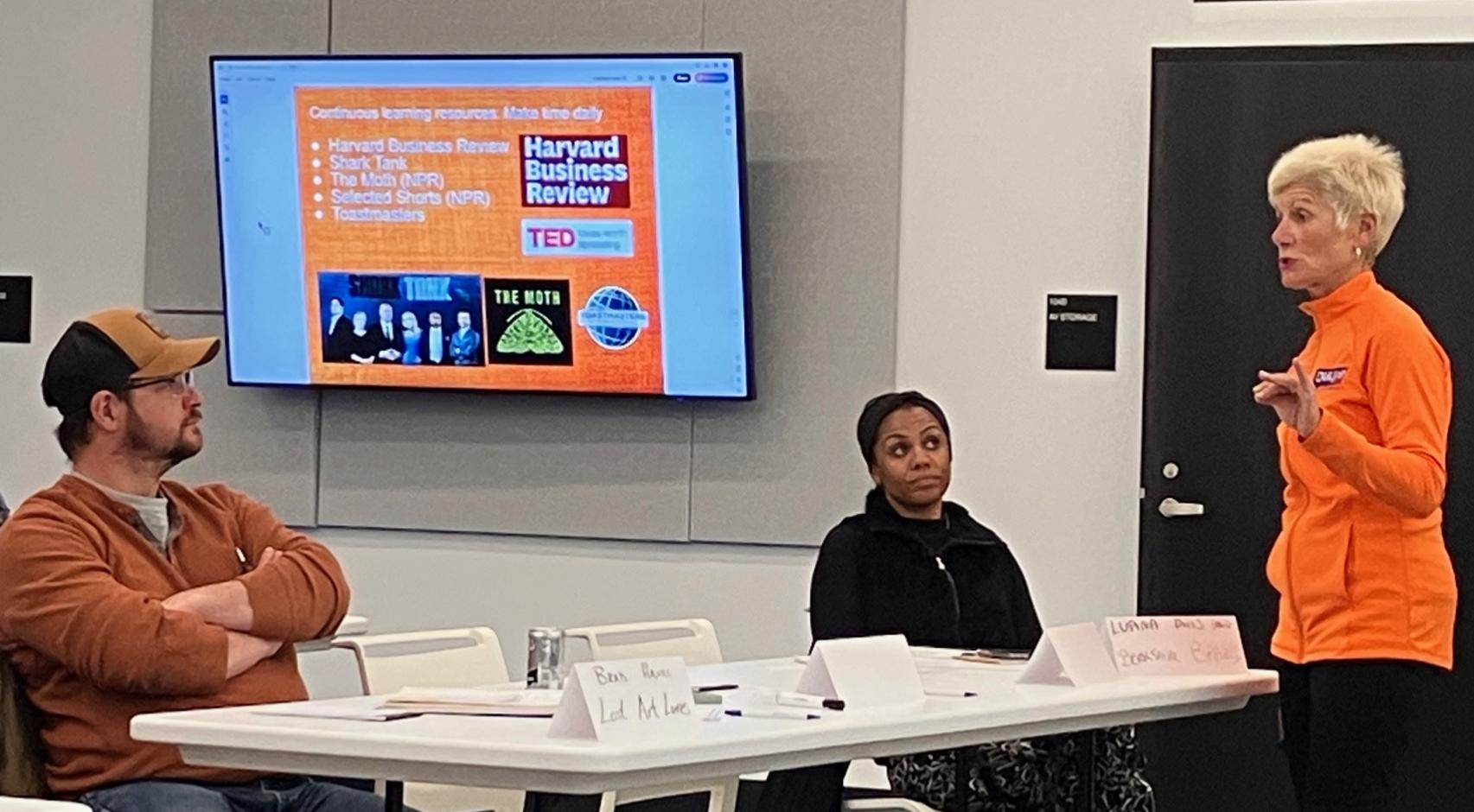 Through conversation and practice exercises, Dulye & Co. and DLE President Linda Dulye coached members of the 2024 Fall Cohort of EforAll Berkshire County on November 12 to confidently project their best in a presentation skills workshop held at the Berkshire Innovation Center.